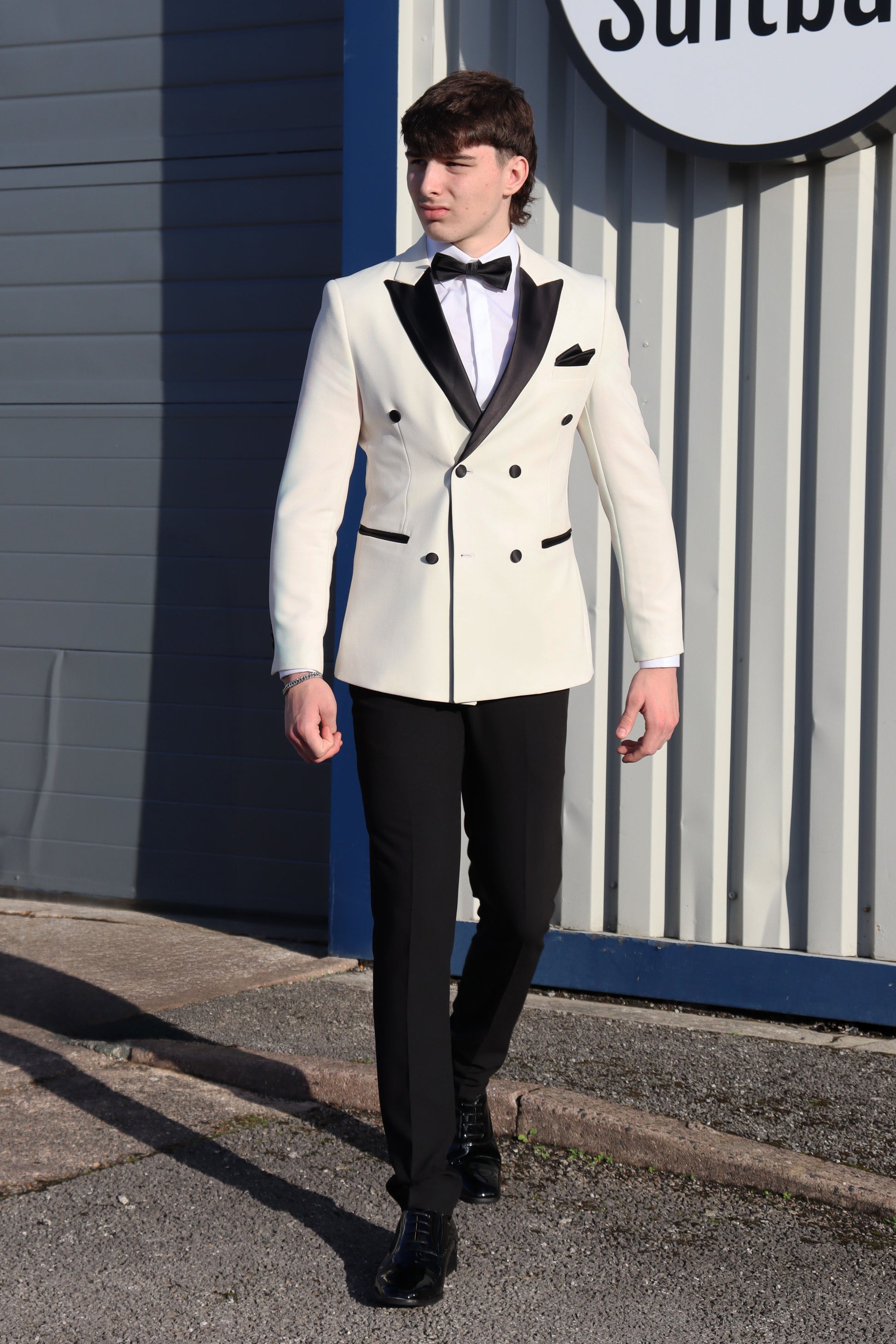 Comes with the Diablo Ivory Double Breasted Blazer, Diablo Ivory Single Breasted Waistcoat and Diablo Black Trousers, plus a SUITBAE hanger and travel bag.