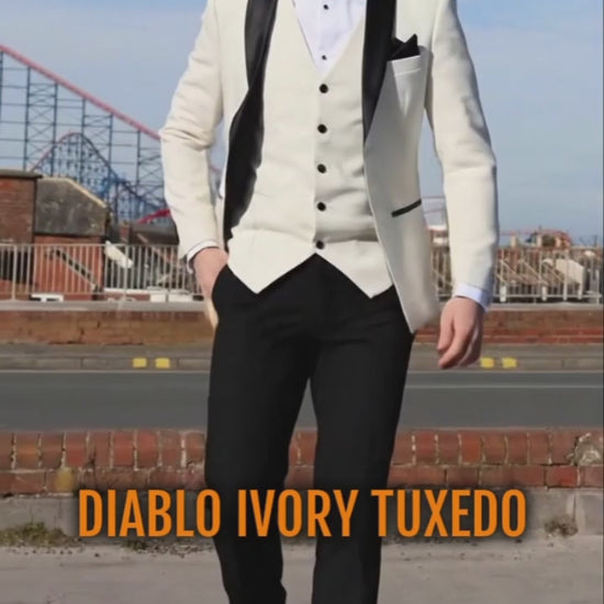 The Diablo Ivory Three Piece Tuxedo is where timeless elegance meets modern edge. Cut in striking ivory with jet-black lapels and a razor-sharp silhouette, it’s built for grooms chasing a show-stopping moment, groomsmen who want to elevate the vibe, and anyone ready to break the mould at a black-tie affair. Includes blazer, waistcoat, trousers, SUITBAE travel bag, and suit hanger.