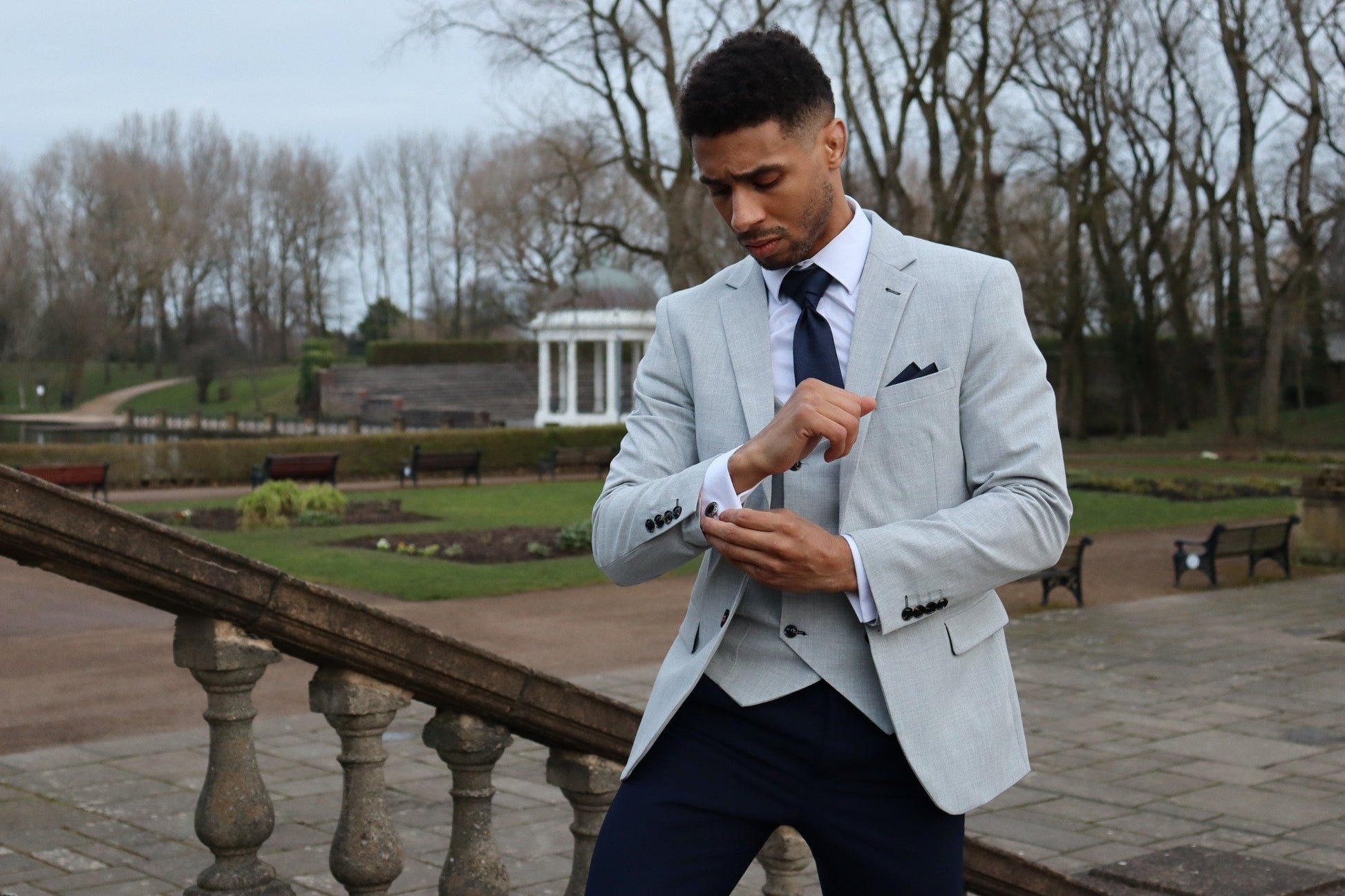 A sharp, modern three piece in a light grey flecked material paired with Lawrence Navy trousers for a modern, sleek look. Crafted from lightweight fabric with added stretch for comfort—perfect for summer weddings, the races, and smart occasions. Includes blazer, waistcoat, trousers, a SUITBAE travel bag and a suit hanger.