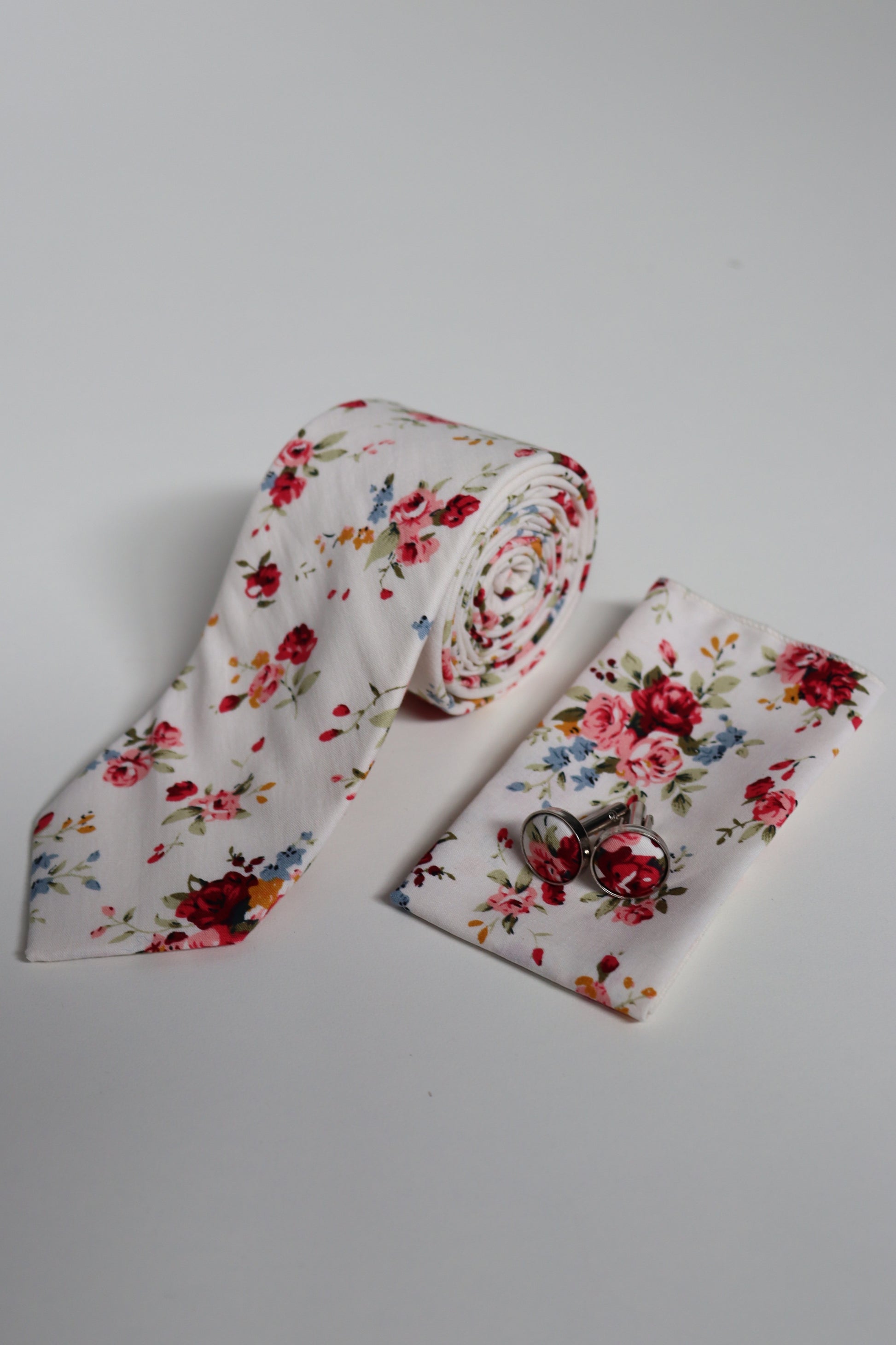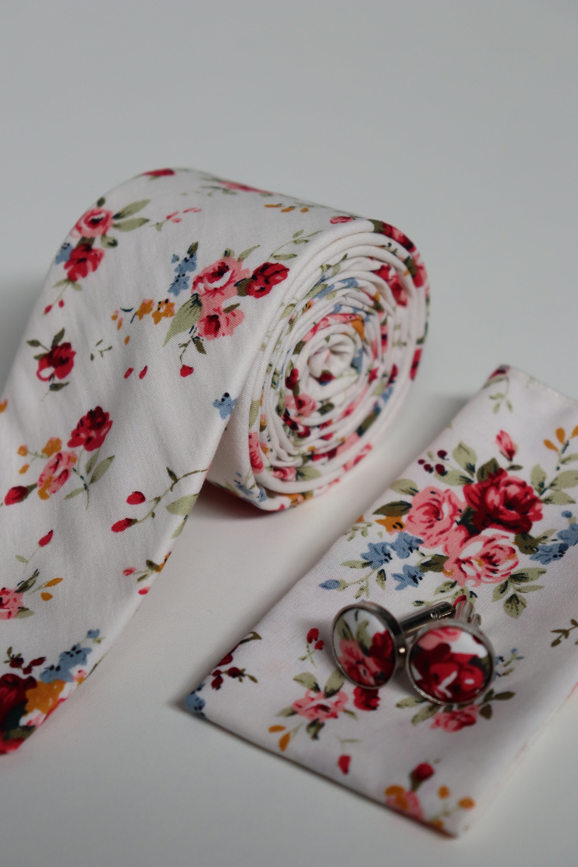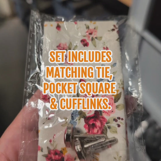 Bring a fresh and romantic touch to formal attire with this three-piece accessory pack in ivory with blush florals - ideal for weddings, garden parties, and spring events. It includes a 100% cotton tie, matching pocket square, and coordinating cufflinks for a seamless, picture-perfect finish.