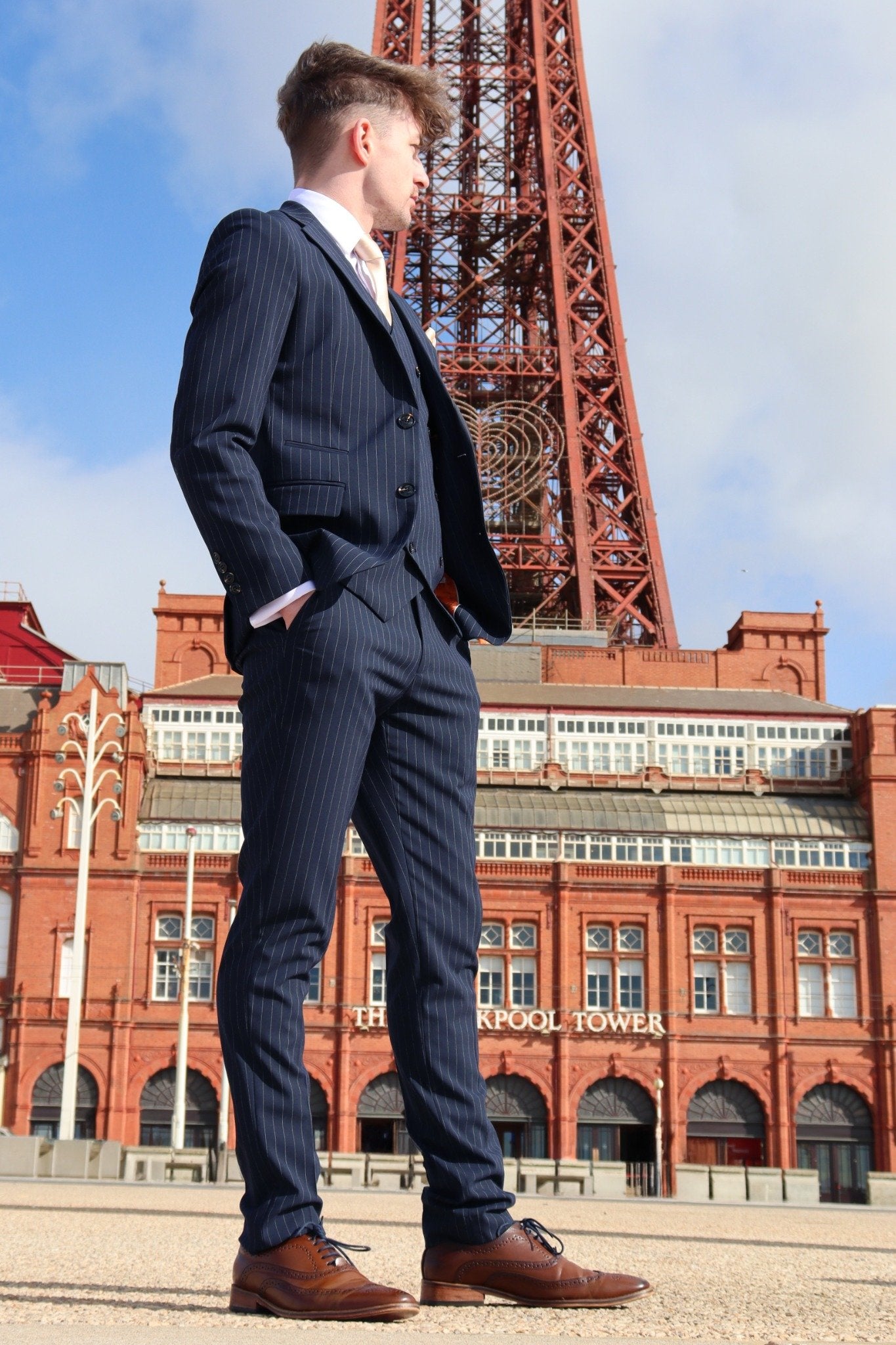 A distinctive choice for proms, formal dinners and evening occasions, while equally sharp for the office, interviews or business events. This navy pinstripe suit is a timeless option.