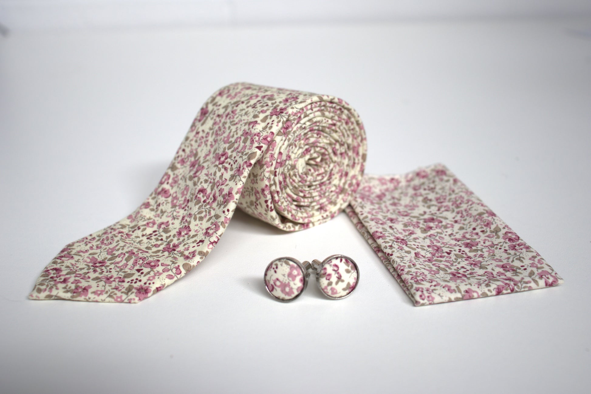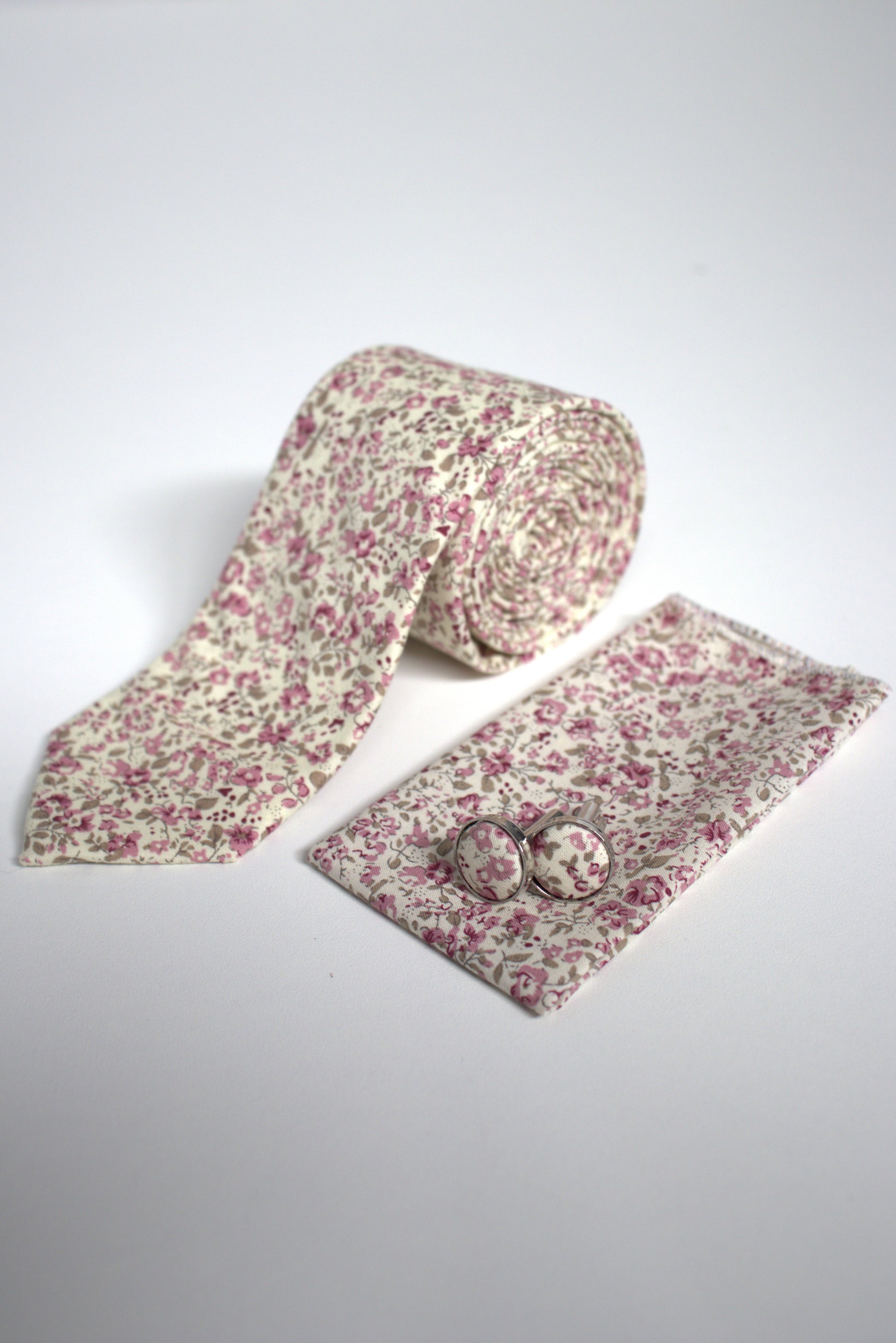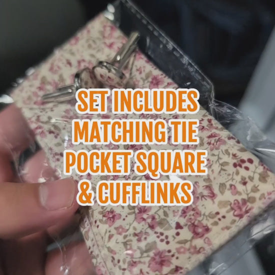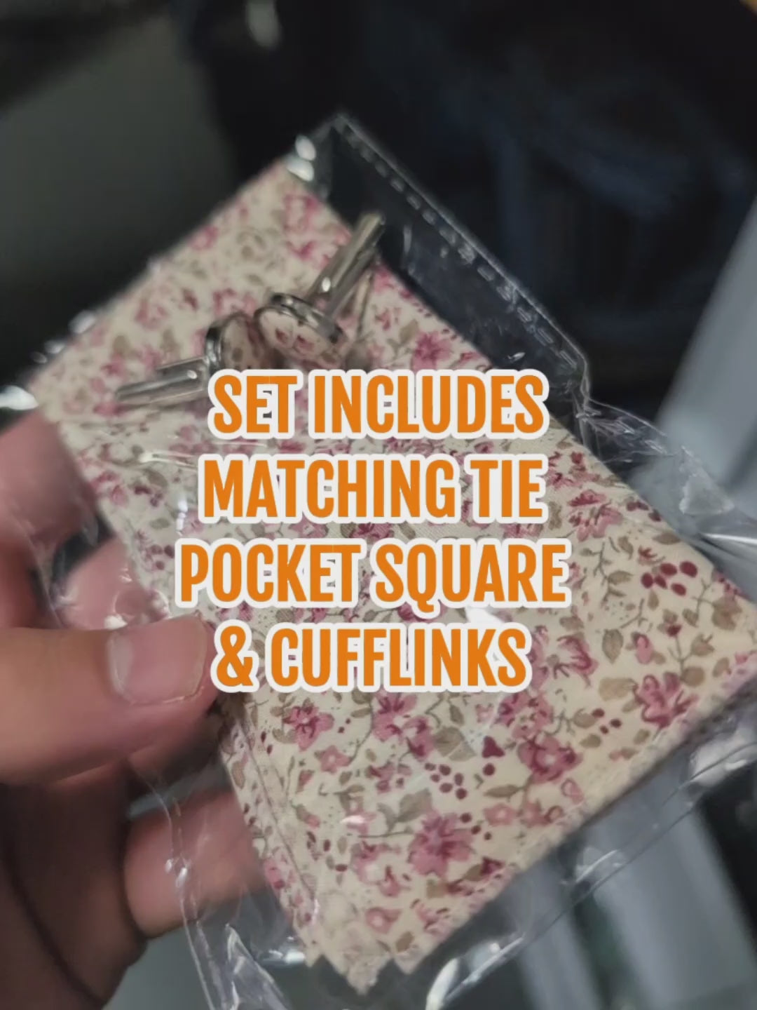 Add a fresh and romantic charm to formalwear with this three-piece accessory pack featuring delicate pink blooms on ivory - perfect for weddings, spring events, and special occasions. The set includes a 100% cotton tie, coordinated pocket square, and matching cufflinks for an effortlessly elegant finish.