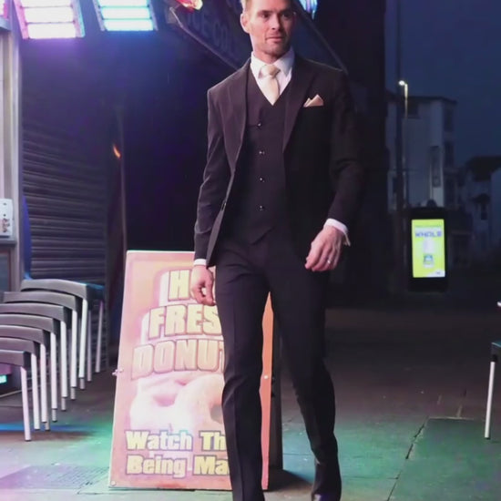 The Black Pinstripe Suit merges timeless style with modern comfort, crafted from a smooth, medium-weight elastane blend for all-day wear. Pinstripes offer a slimming, elongating effect, enhancing the overall silhouette and adding a touch of refined sophistication. Includes blazer, waistcoat, trousers, a SUITBAE travel bag and a suit hanger.