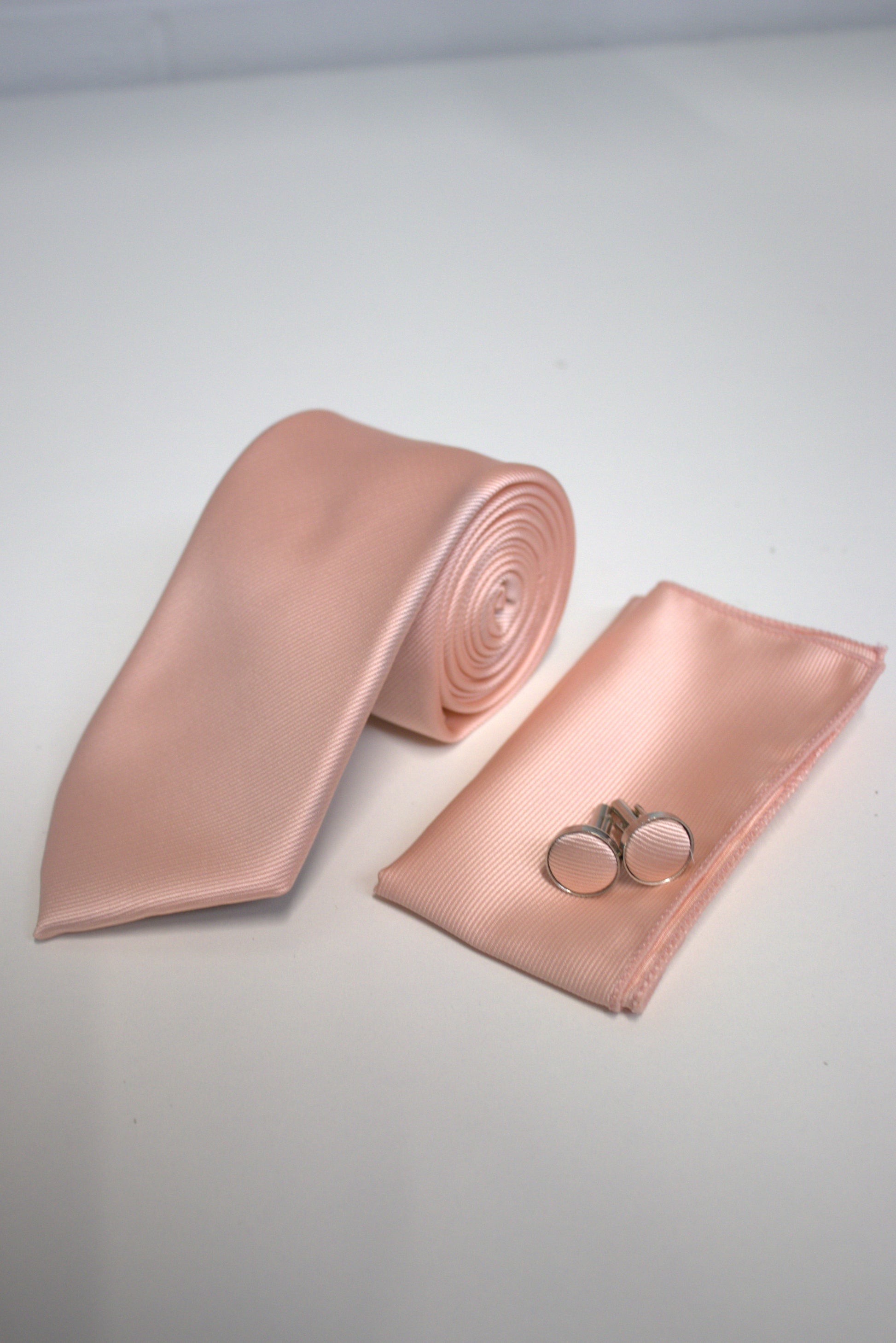 A soft and stylish three-piece set in blush pink twill. Perfect for weddings, proms, and special occasions. Includes a tie, pocket square, and cufflinks so your outfit is complete and matching.