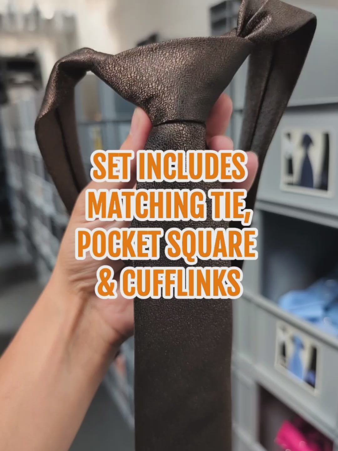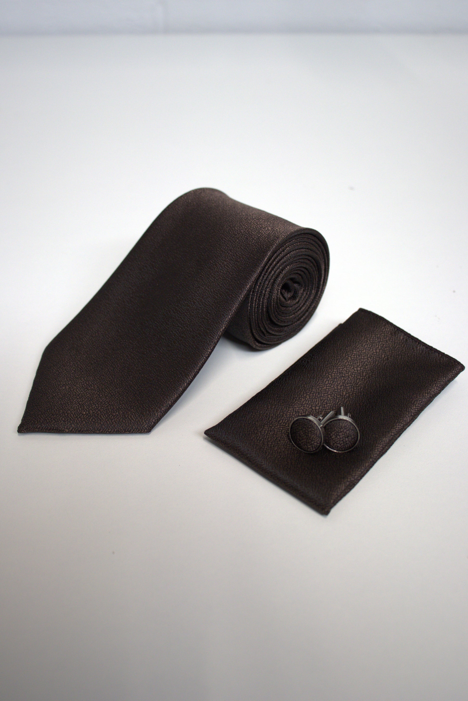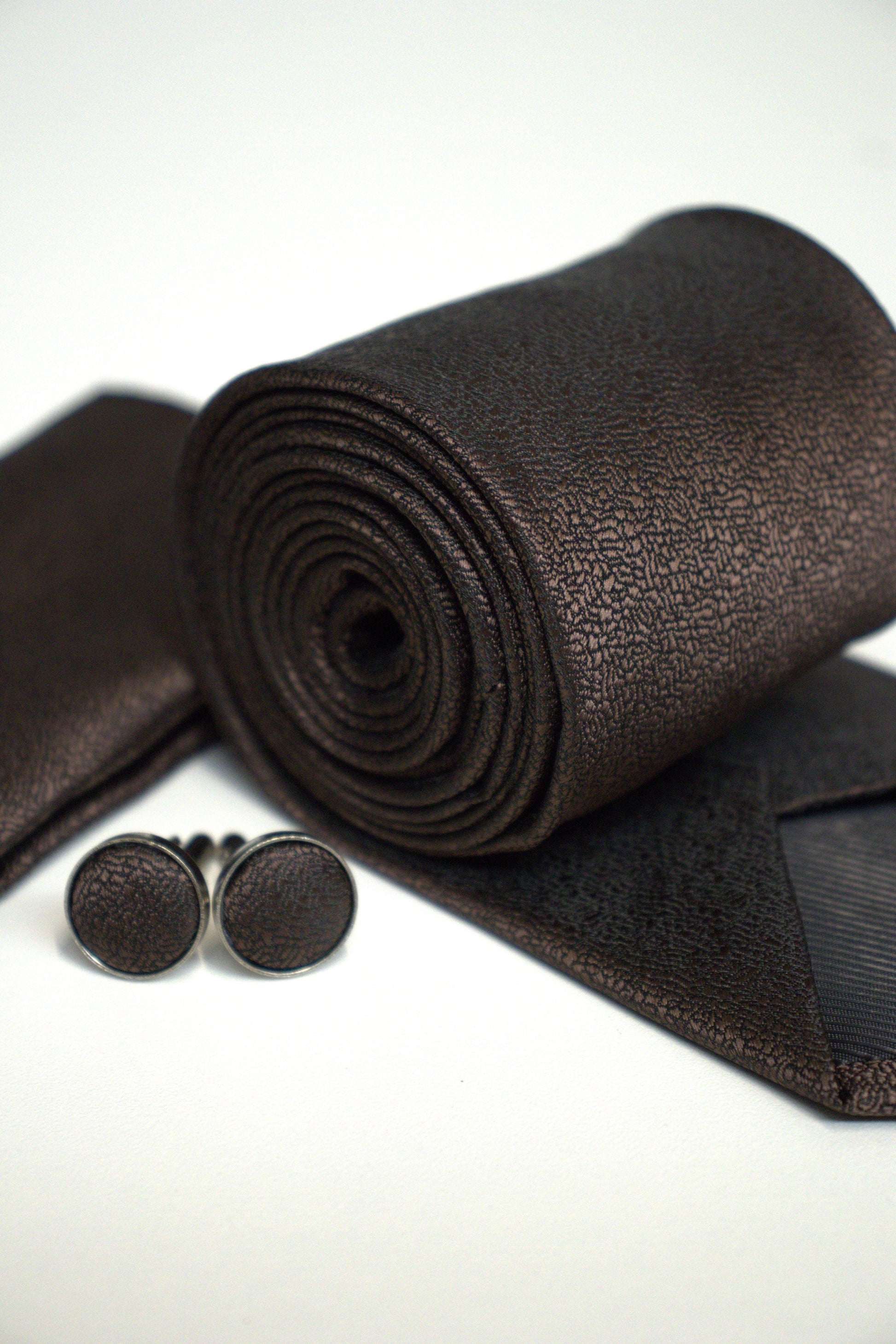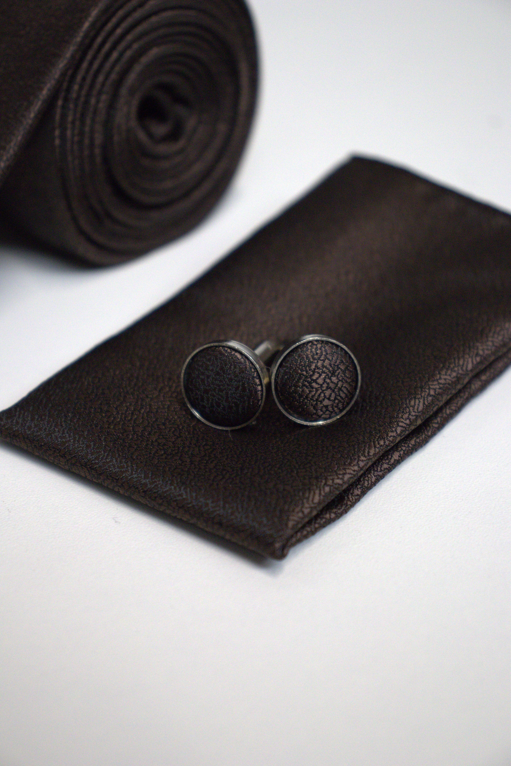 A luxurious tie set in rich bronze, also perfectly described as dark brown, coffee brown or chocolate brown. It adds warmth and depth to your outfit - ideal for autumn weddings, business events, or evening occasions. The set includes a tie, pocket square, and cufflinks to complete the look with subtle sophistication.