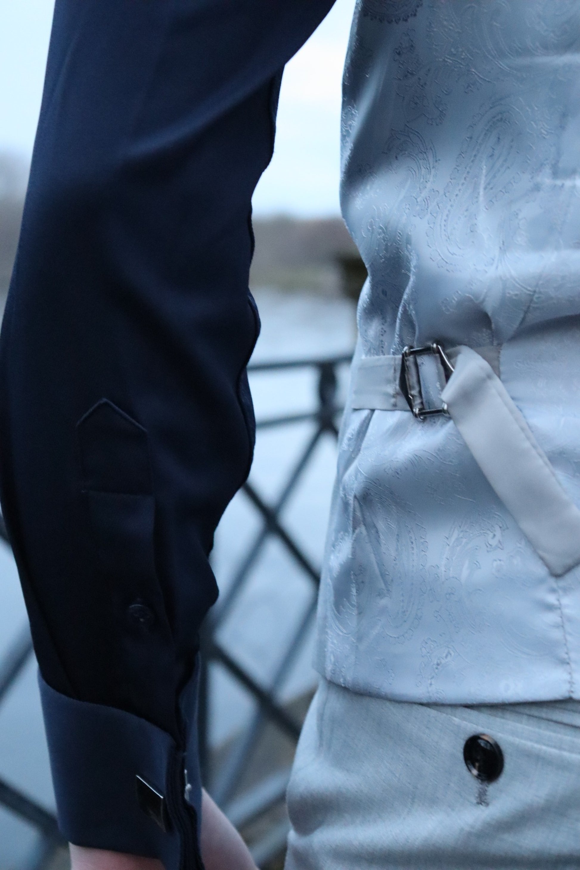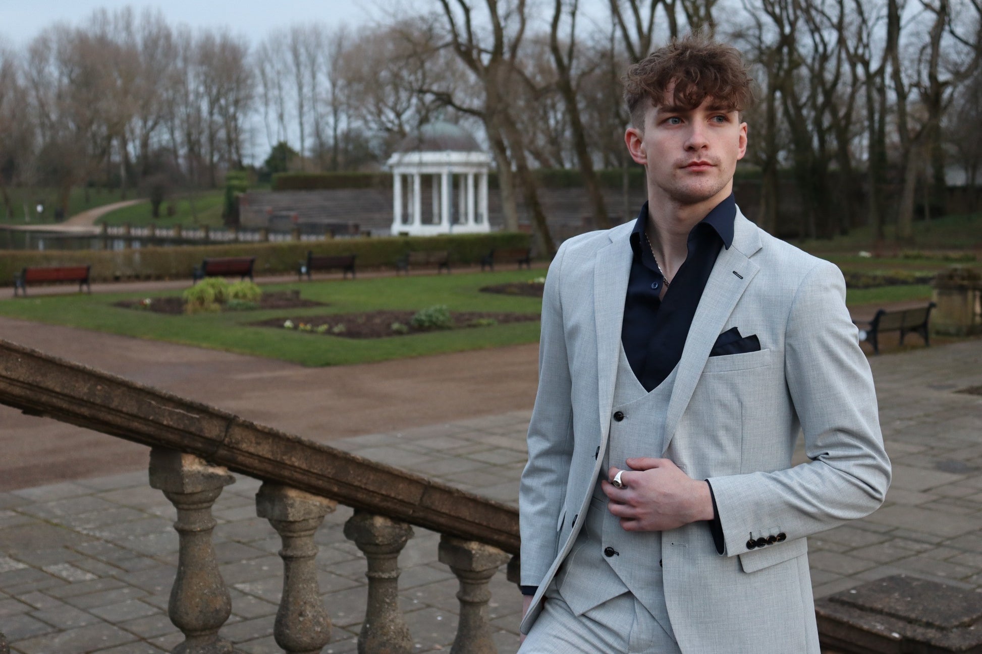 A sharp, modern three piece in a light grey flecked material. Crafted from lightweight fabric with added stretch for comfort—perfect for summer weddings, the races, and smart occasions. Includes blazer, waistcoat, trousers, a SUITBAE travel bag and a suit hanger.
