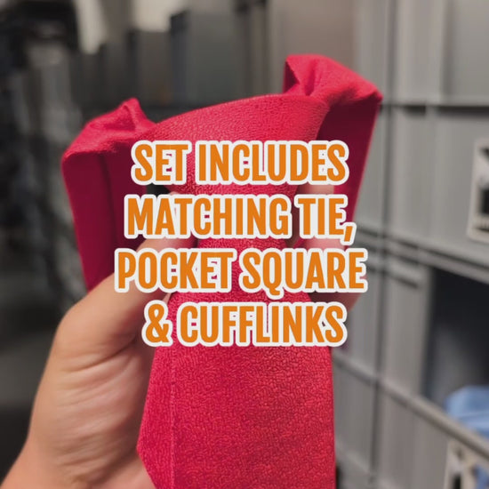 A bold tie set in a striking red shade - often called bright red, scarlet red, or Liverpool red. This colour brings strong impact to any outfit, making it ideal for weddings, parties, or formal events where you want to stand out. The set includes a tie, pocket square, and cufflinks for a fully matched finish.
