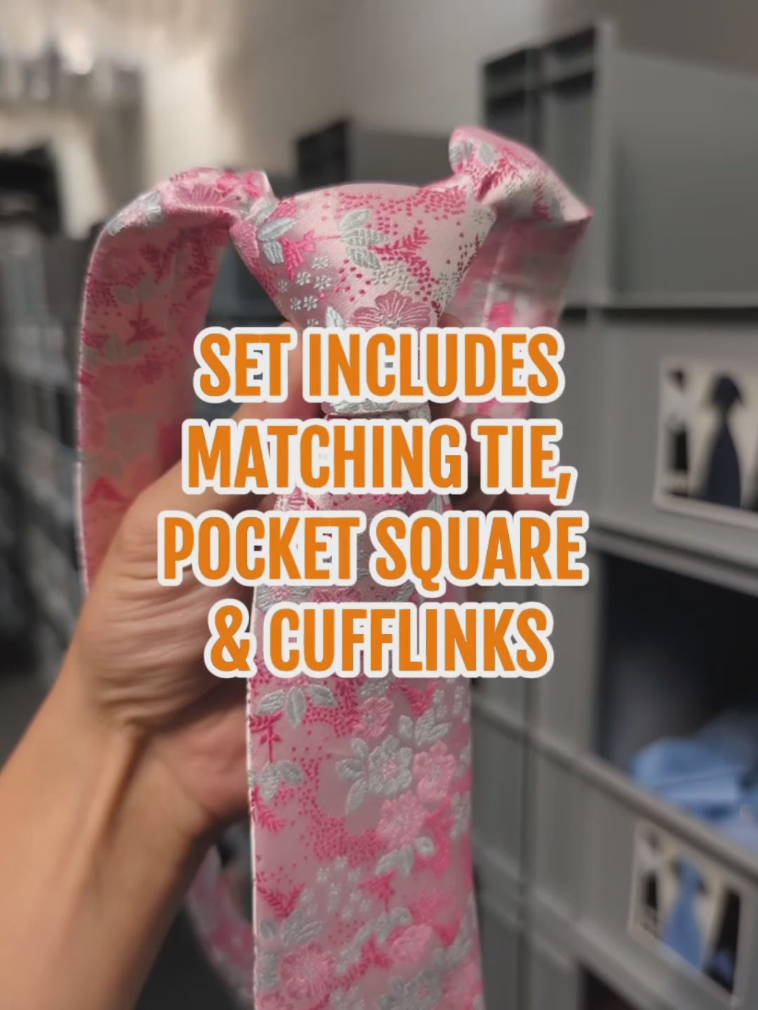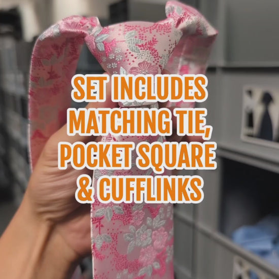 This is a stunning standout tie set - with a floral pattern that shifts through various shades of pink and white depending on how the light and angle change. You’ll notice everything from baby pink and bright pink hues to soft blush tones come to life. Ideal for weddings or the races, especially if you’re matching your partner’s pink dress or following a pink-themed event - there are so many pinks in this tie, one is sure to match perfectly.