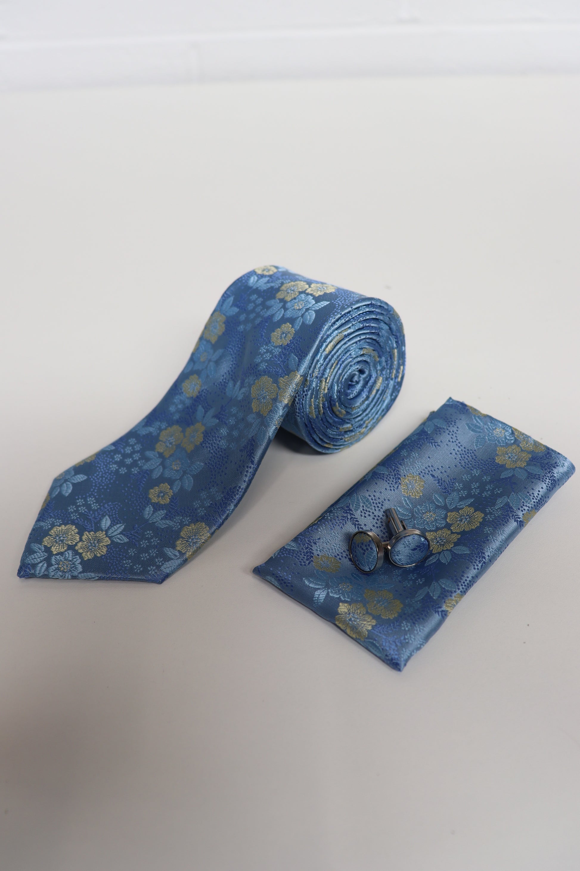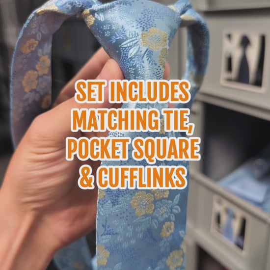 A bright sky blue floral set - perfect for weddings, spring events, or summer parties. Includes a tie, pocket square, and cufflinks so your outfit is smart and matched.
